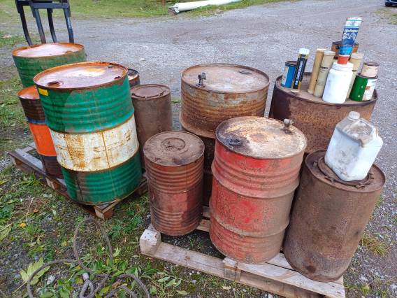 Tomfat och fat med olja samt fett. Lasthjälp finns.