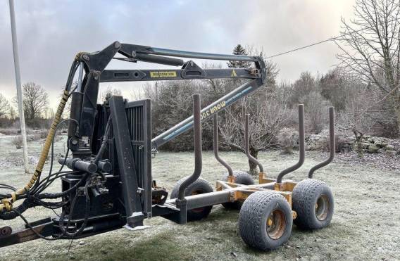 Beg skogsvagn Mowi WO 10 med Mowi 300 kran. Årsmodell -04. Hydrauliska stödben. Ramstyrning. Radiostyrd winch. 3 bankar. Flerspaks ventilpaket. Fint skick! Inkommande!