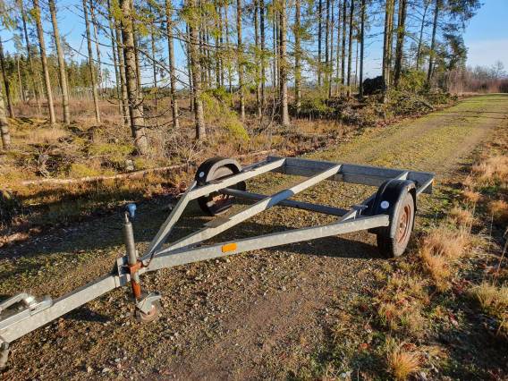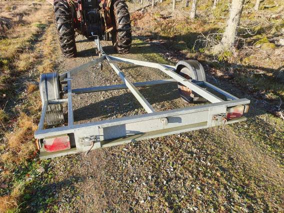 Galvat oreggat chassie säljes -obromsat med 13 tums hjul med fjädrande axel..155cm bred ram mellan hjulen.vändbart drag för kula eller traktor ..lämpligt att montera en IBC på för vatten eller köra en rundbal på ? 3000 kronor inkl moms