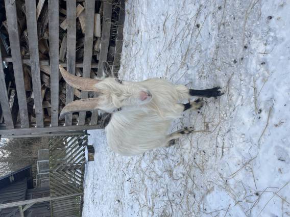 Lantras. Snäll/tam göingebock säljas. Teckning helvit med svarta ’strumpor’. Egen avel. Reggad i Allmogege-föreningen.